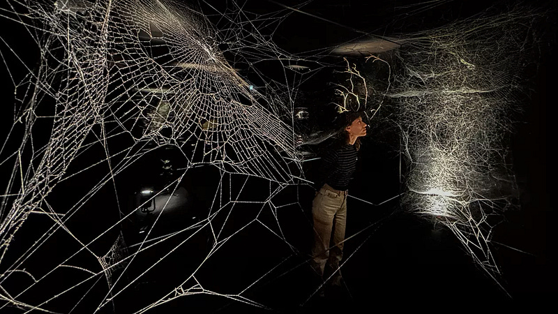 The show’s most captivating work is by the spiders themselves. Geometric intricacies of illuminated webs are on full display. The silks’ silver-to-gold gradient is stunning — and natural; docents confirmed the webs were “unedited” (other than a local spider’s recent contribution to one of the sculptures). Some webs were housed in plexiglass while others were unenclosed, swaying from the displaced air of visitors. Despite their fragility and impermanence, they felt vast and cosmic (even mirroring a recent image from the James Webb Space Telescope). A stained-glass “arachnid confessional” was a surprise. The webs’ substitution for a priest felt appropriate, comforting.